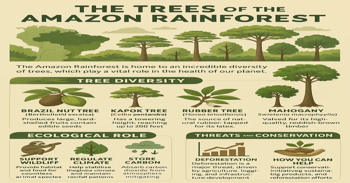 The Amazon Rainforest, often called the “lungs of the Earth,” is home to over 16,000 tree species—many of which are found nowhere else. These towering giants – like Kapok, Mahogany, Brazil Nut, and Rubber-provide critical resources, support unparalleled biodiversity, and store enormous amounts of carbon. In this post, we’ll explore their ecological importance, the threat of deforestation, and how each of us can help safeguard this vital ecosystem. Plus, don’t miss our eye-catching infographic summarizing it all!