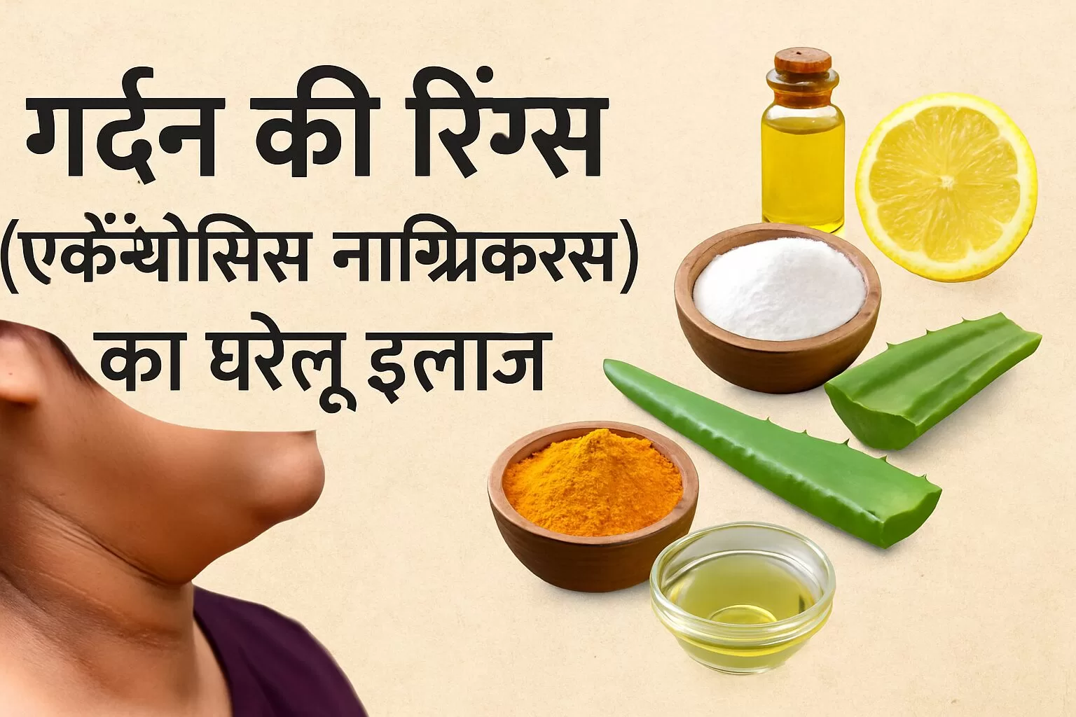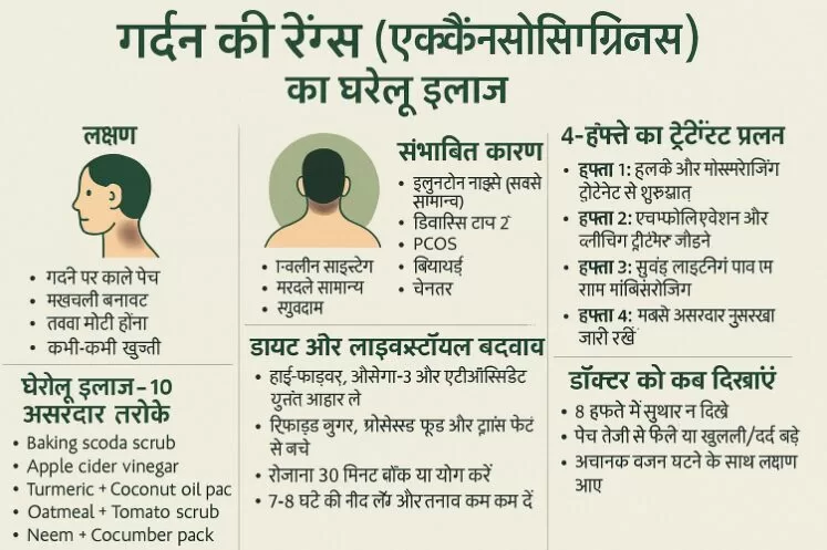 गर्दन पर काले रिंग्स(gardan ki rings ka gharelu ilaj) या पैच दिखना एक आम समस्या है, जिसे मेडिकल भाषा में Acanthosis Nigricans कहते हैं। यह अक्सर इंसुलिन रेजिस्टेंस, डायबिटीज, पीसीओएस, थायरॉइड या हार्मोनल बदलाव के कारण होता है। इसका घरेलू इलाज संभव है, लेकिन धैर्य और नियमितता जरूरी है।